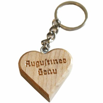 Handgemachter Schlüsselanhänger in Herzform mit eingraviertem Augustiner Logo. Aus Ahornholz, geölt. Größe des Herzes ca. 4x4 cm